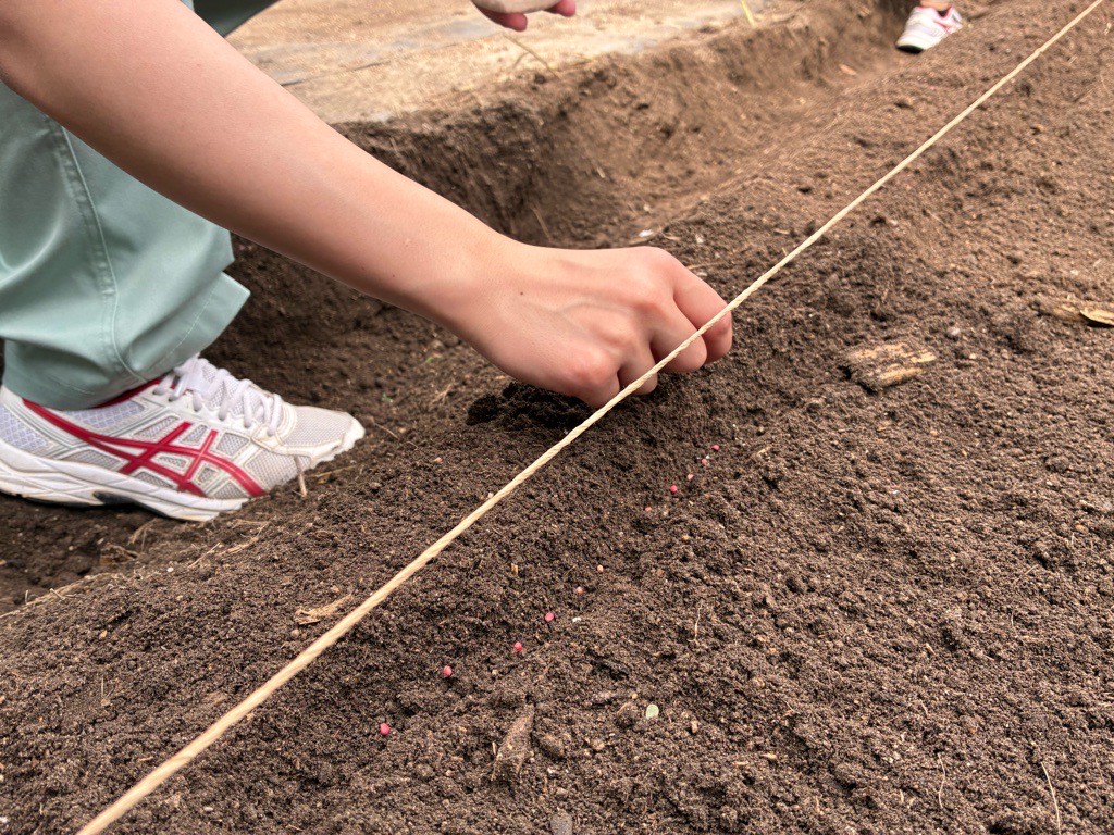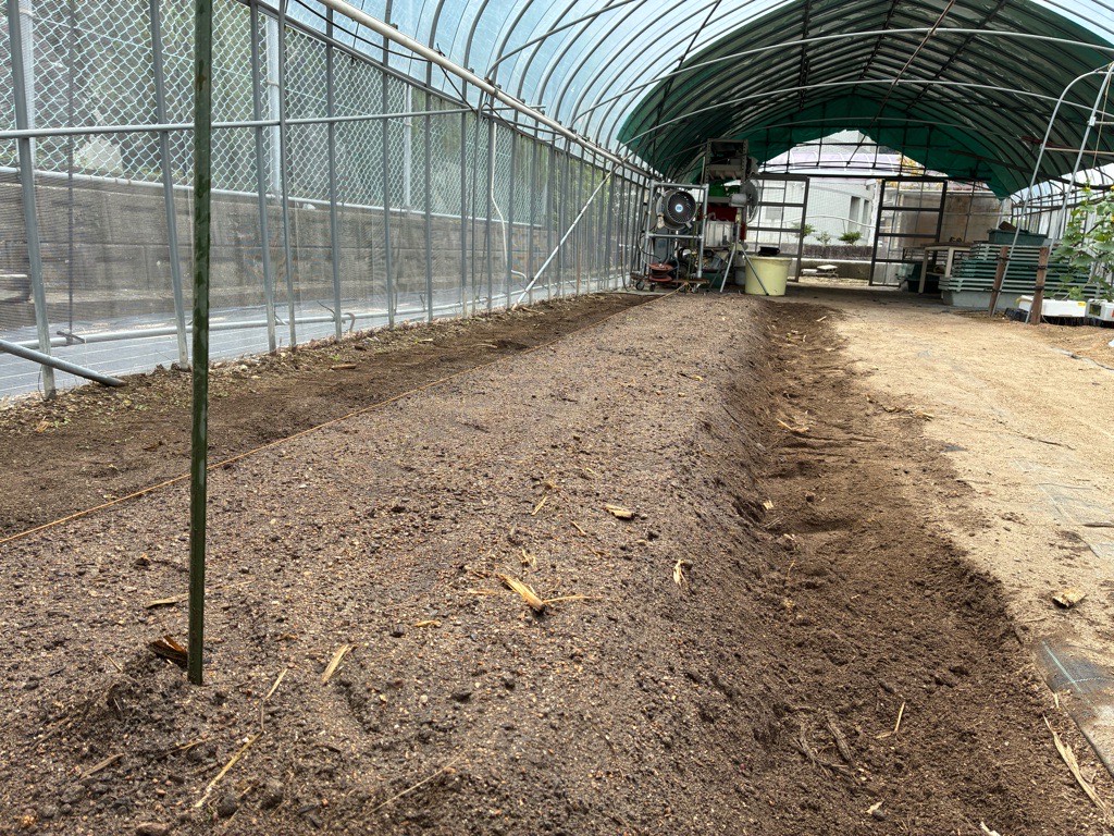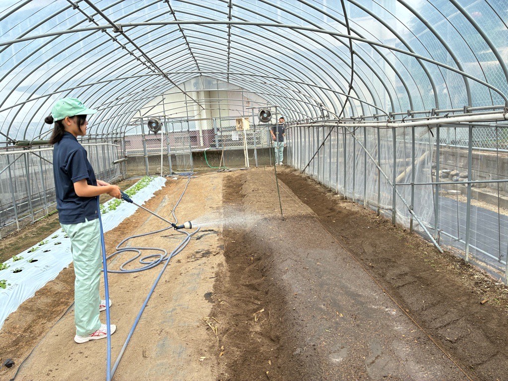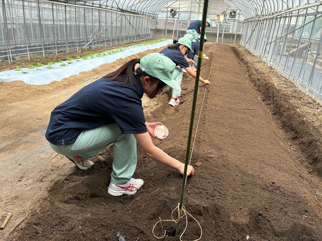 環境科学科3年生が「総合実習」で、ホウレンソウの種子を「すじ撒き」しました。先週の雨からやっと平均気温が25度付近になり、蒔き時になったので行いました。収穫まで1か月半かかるので「城南祭」に間に合えばと思っています。また、品種を2種類蒔いたので成長に違いがあるか生徒と検証したいと思っています。来週は「コマツナ」を蒔く予定です。