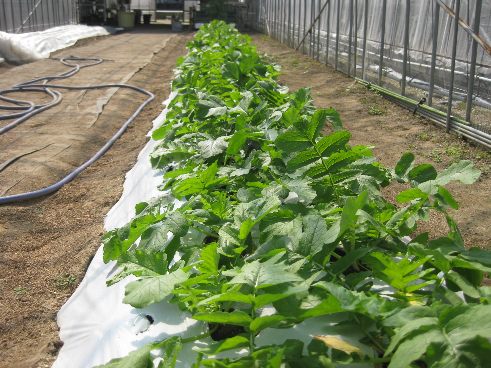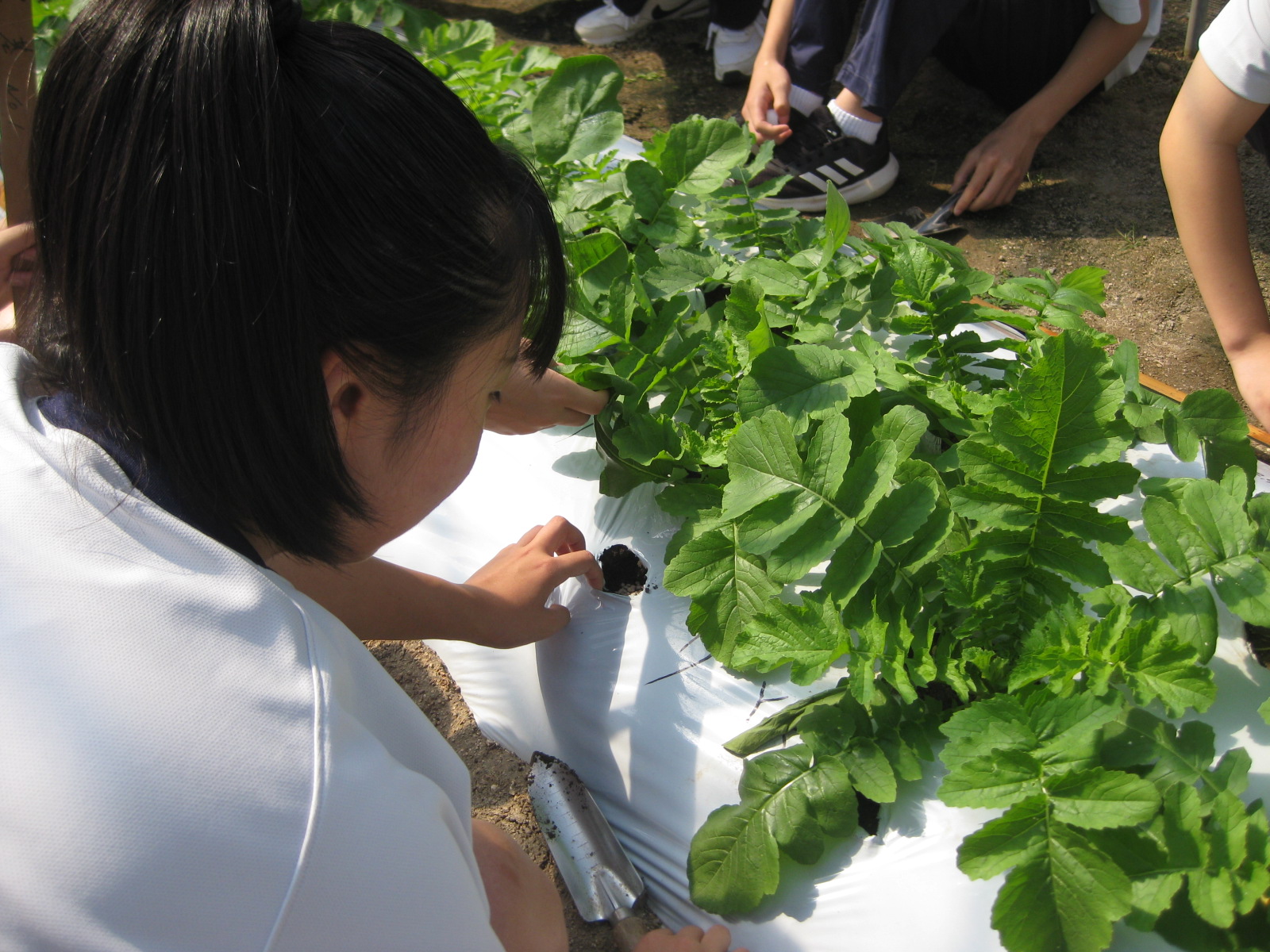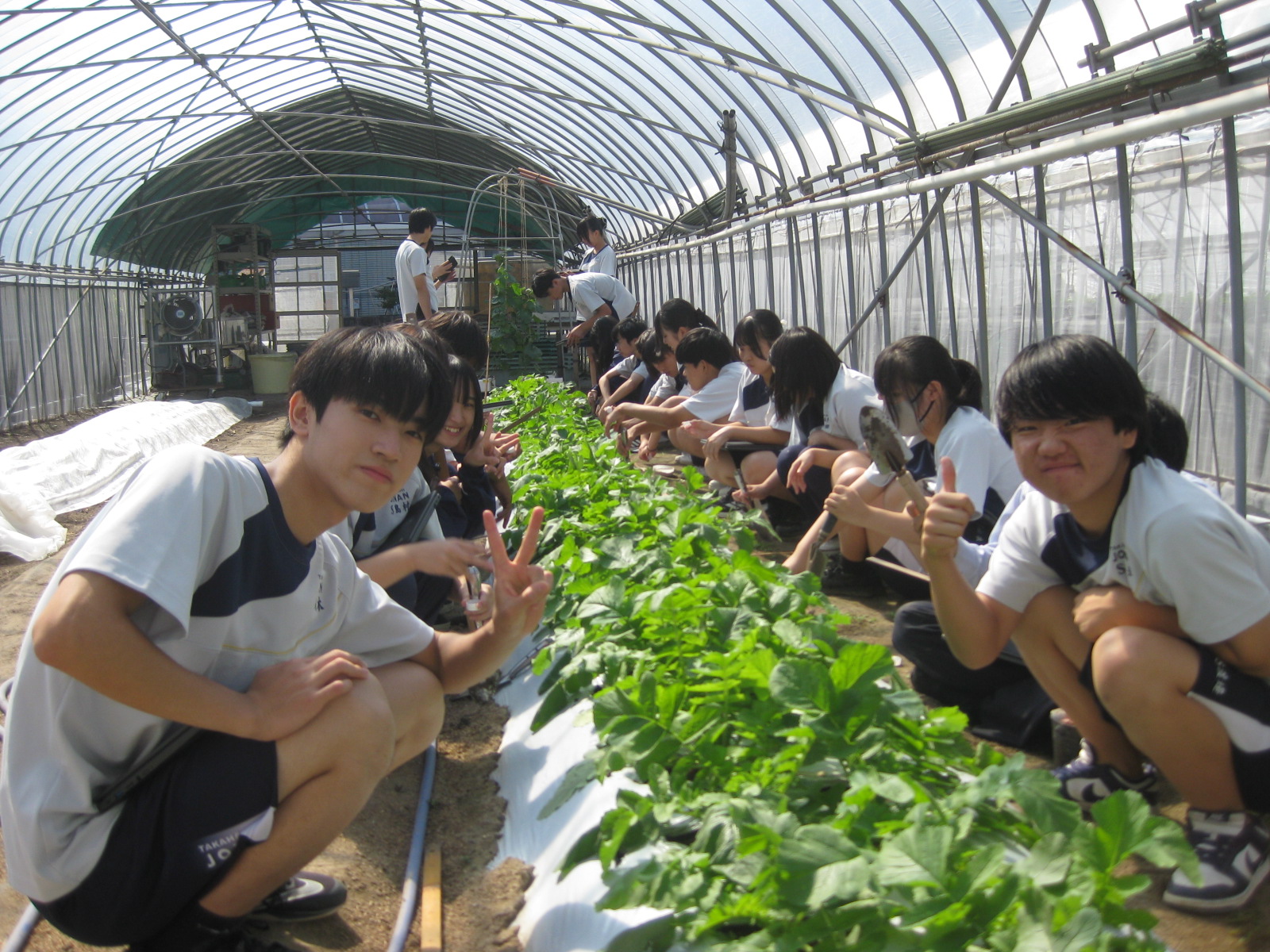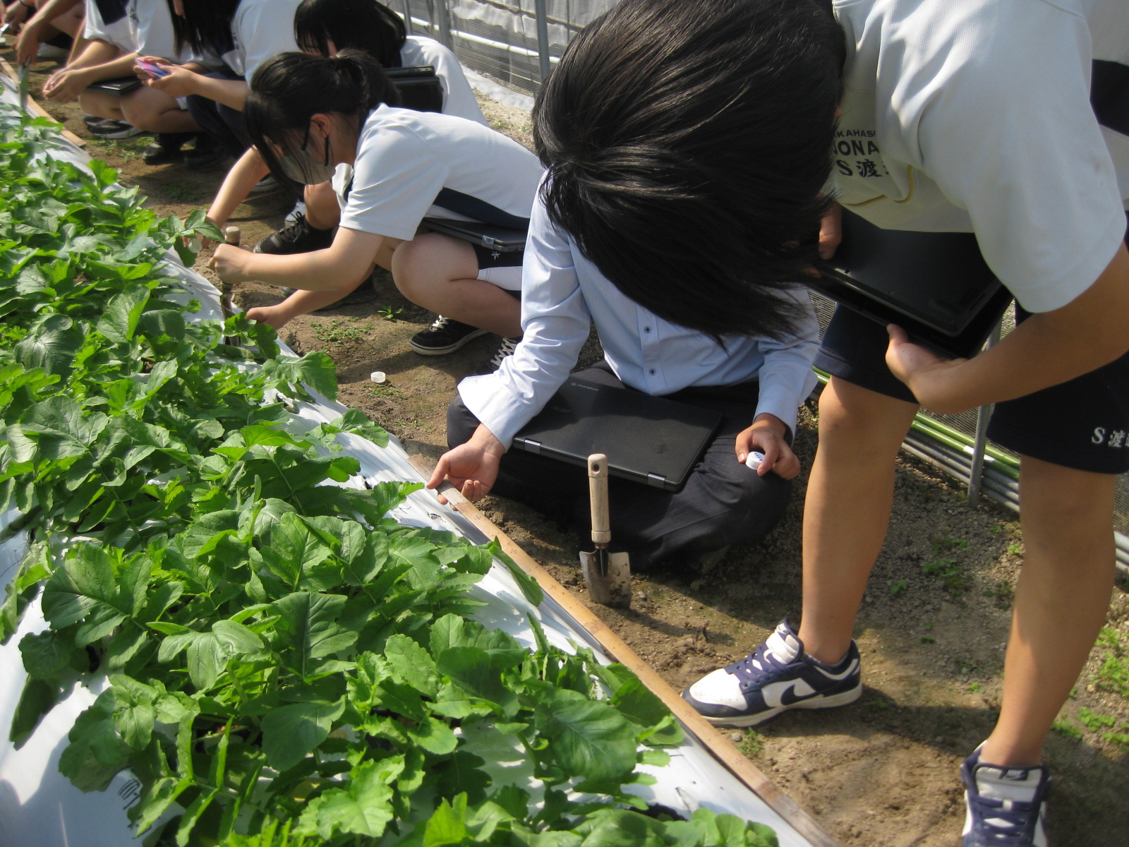 環境科学科1年生が「農業と環境」の授業で栽培しているダイコンに2回目の追肥とChromebookで写真撮影を行いました。ダイコンの生育は、前半に葉が大きくなります。それに合わせて追肥の位置も決まります。今回は、その大きさを分かりやすくするために「竹尺」を利用して写真を撮影してみました。記録表のコメントに「葉が大きくなって根のことまで考えて追肥をするとは思わなかった」、「個体差はあるけどかなり大きくなっている」、「比較対象をおくと実物の大きさが見えることがわかった」など書かれていました。