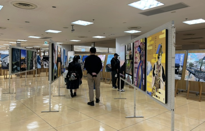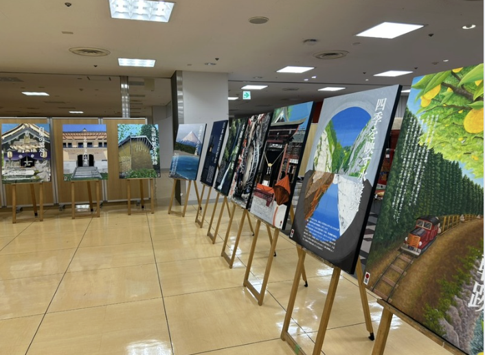 会場には、デザイン科の生徒一人ひとりが制作した日本遺産をテーマとしたポスター原画を展示。地域文化への理解と表現力を融合させた作品は、来場者の皆さまから高い評価をいただきました。