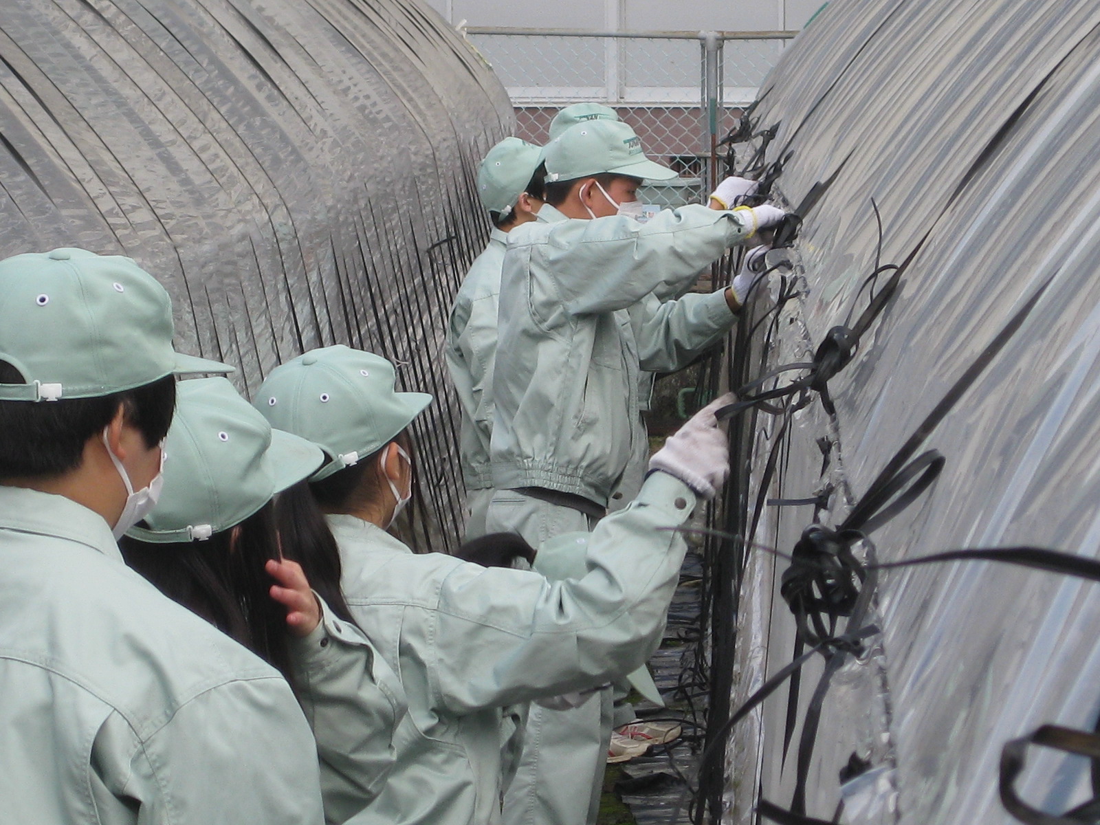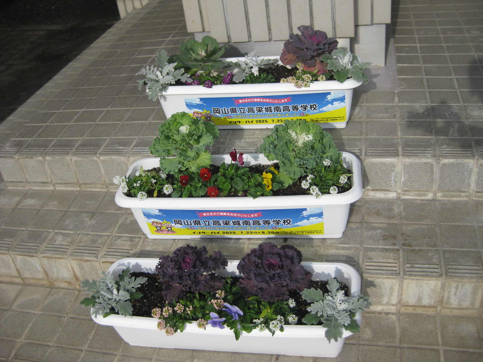 今週の草花は、城南祭も無事終わり施設・設備の修繕や校内美化に努めました。先週の花壇更新の続きで玄関のプランターをハボタンなど秋花苗に更新したり、ビニルハウスの側窓ビニルを新しく張り替えました。本格的に寒くなる前にできてよかったです。あまり経験していない作業でしたので生徒も苦戦していました。寄せ植えやヒモの結び方も復習できたと思います。