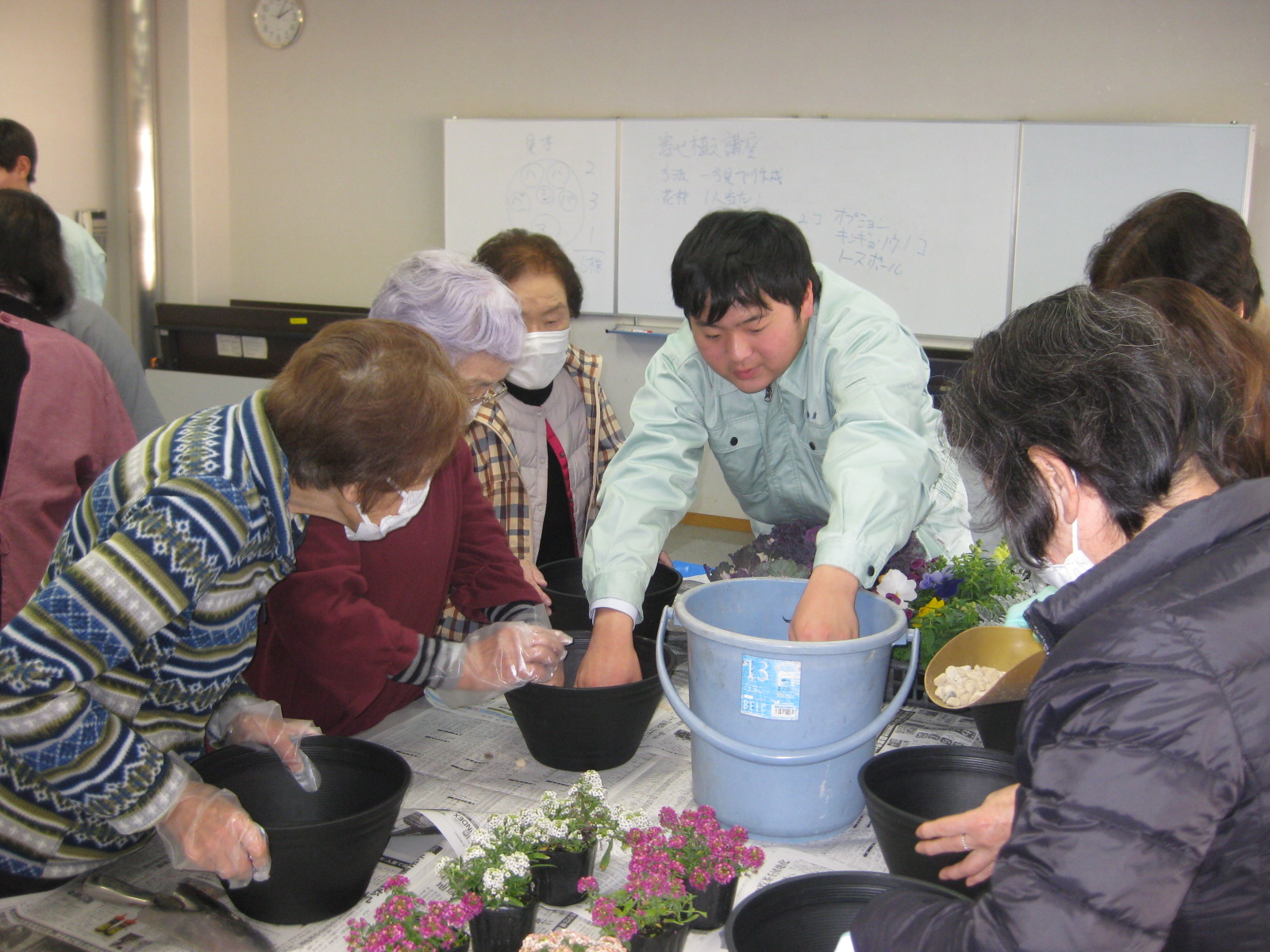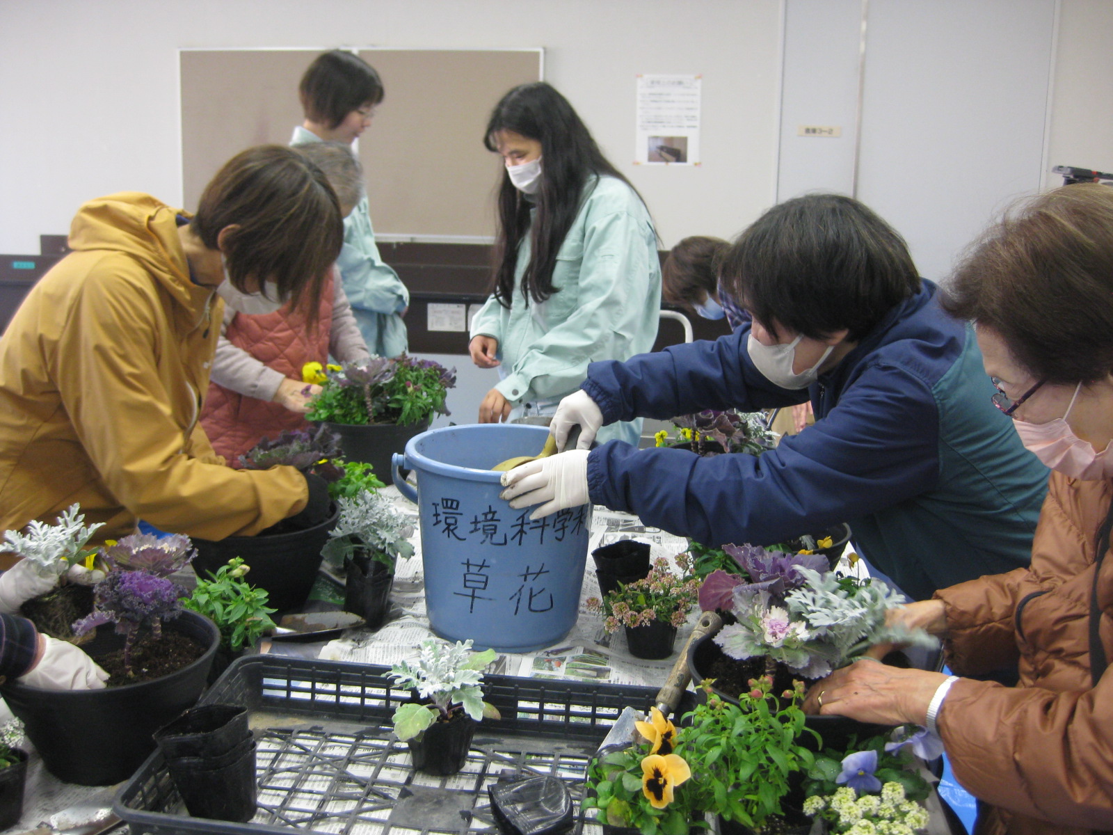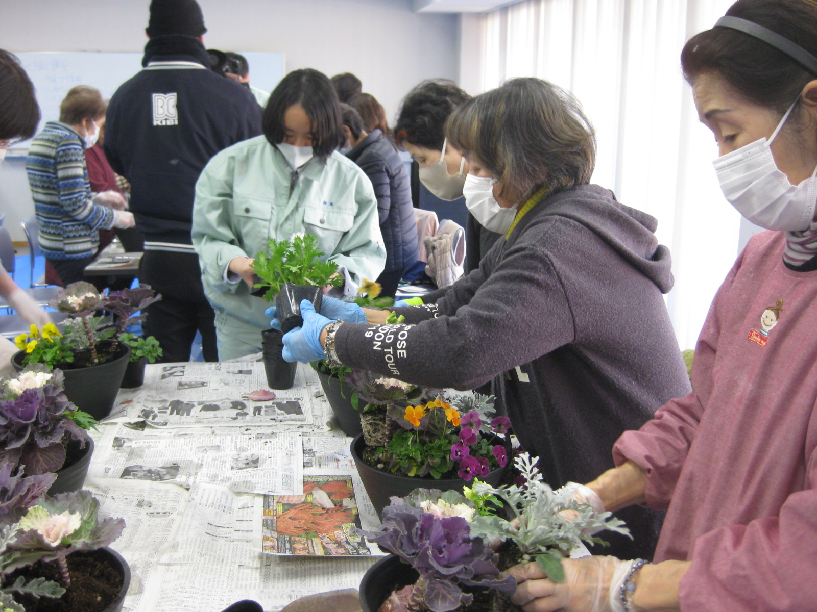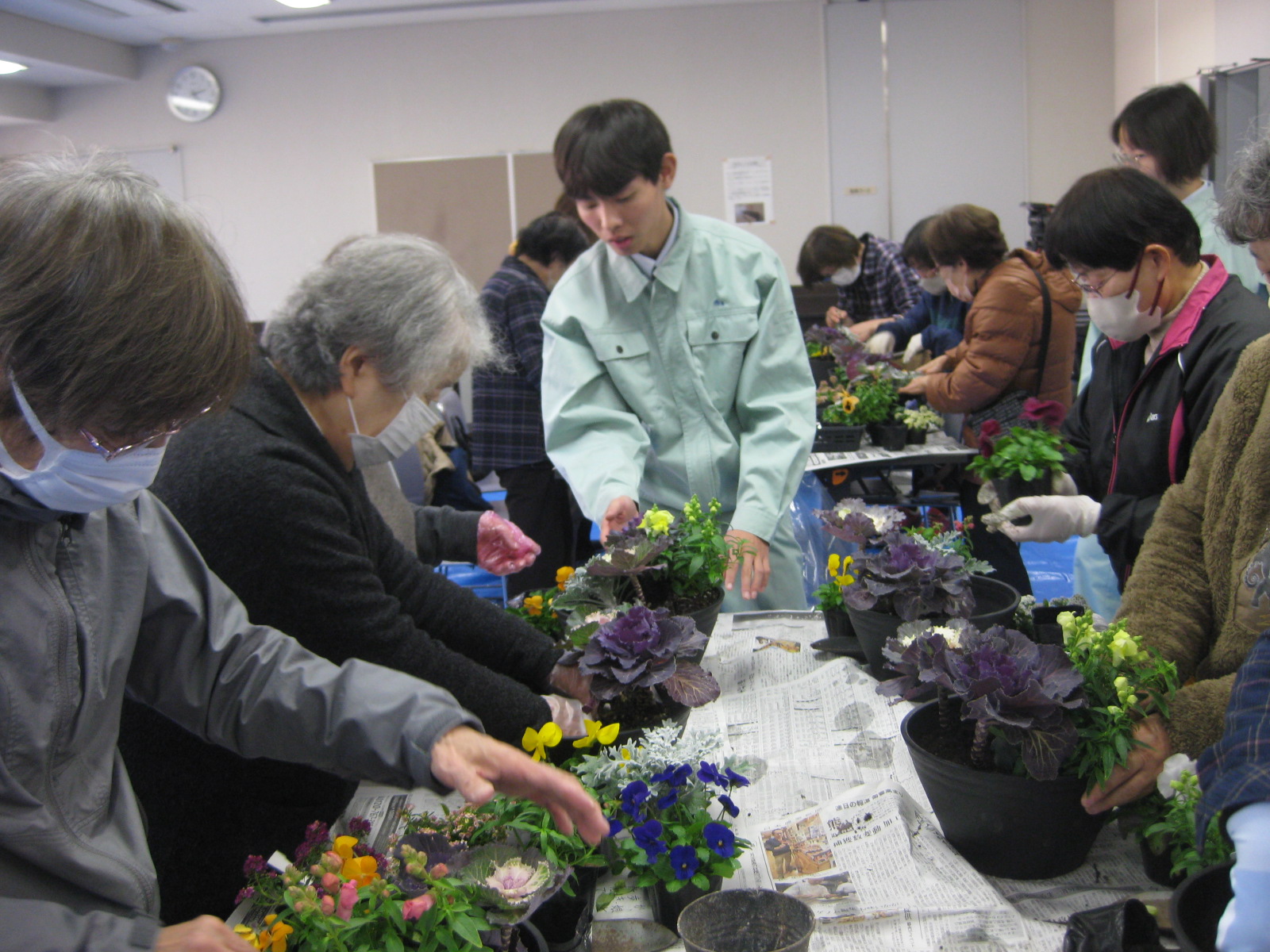生物コース園芸専攻生が市公民館で婦人会の方々と「寄せ植え」を作りました。花材はハボタンやパンジー、ビオラ、シロタエギク、アリッサムなどを使いました。生徒も、文化祭で寄せ植えを作成していますのでそれそれの経験を活かして頑張って対応していました。最後に、いくつか代表的な寄せ植えを紹介して皆さんと共有しました。生徒は良い経験になったと思います。