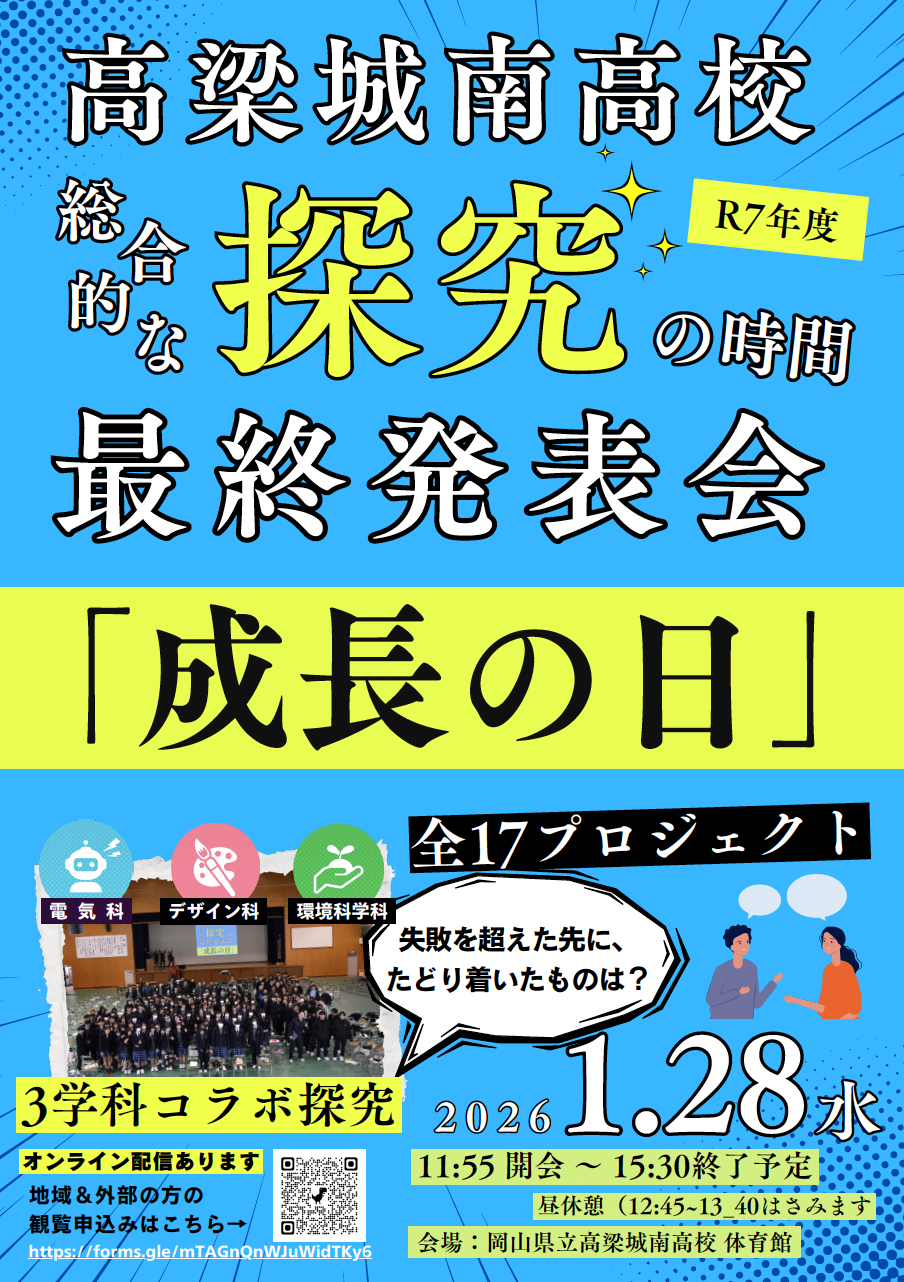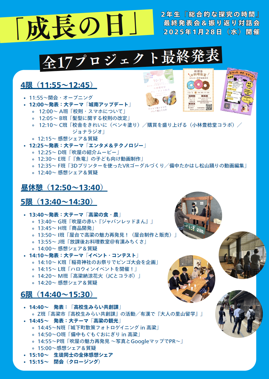 今年度は全17プロジェクトが始動し、校則の見直しから特産品を使った商品開発、地域の観光PR動画制作まで、多岐にわたる活動を展開してきました。当日は生徒による発表に加え、地域の皆様との振り返り対話会も予定しております。