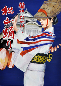 【コメント】踊り子の凛々しさと松山城の存在感を表現するために踊り子の背中を反らし、松山城を見上げるようにして描きました。また夜をイメージする紺色を背景に提灯を描きました。